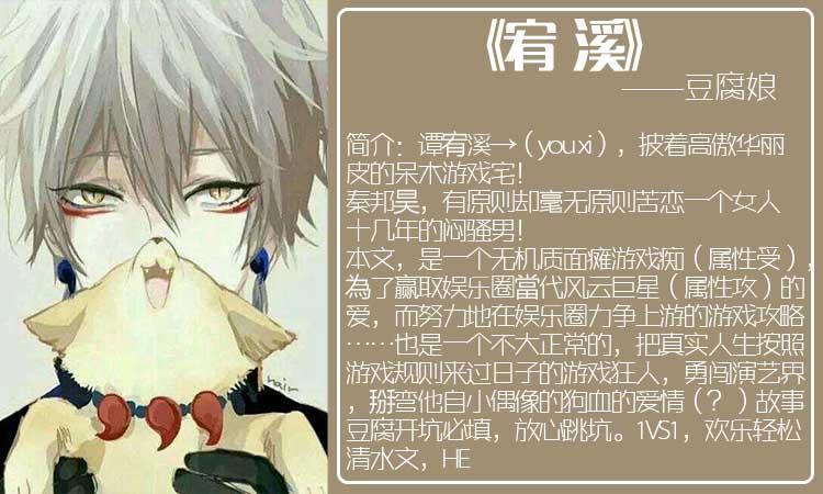 短评:天然呆软萌受,谭宥溪,披着高傲华丽皮的呆木游戏宅!秦邦昊,有原则却毫无原则苦恋一个女人十几年的闷骚男!本文,是一个无机质面瘫游戏痴(属性受);为了赢取娱乐圈当代风云巨星(属性攻)的爱,而努力地在娱乐圈力争上游的游戏攻略……;也是一个不大正常的,把真实人生按照游戏规则来过日子的游戏狂人,勇闯演艺界,掰弯他自小偶像的狗血的爱情故事,非常萌的一篇文,甜宠无虐,完结,he,强推。