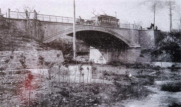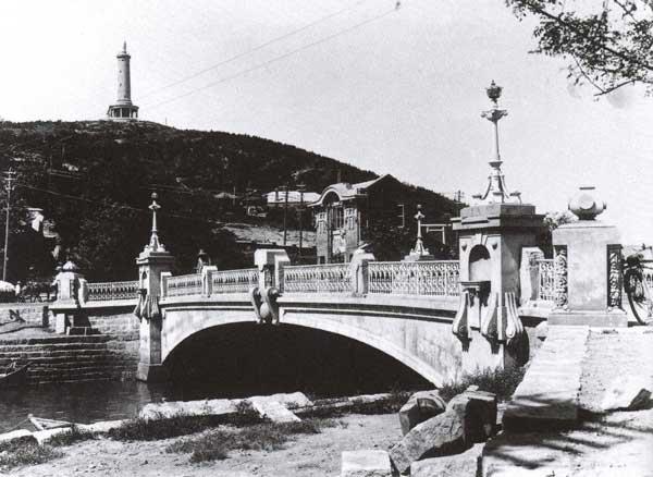 1908年,日本人后来将木桥改建为钢筋混凝土的单孔拱桥。1922年,加宽桥面、设护栏,起名常盘桥。这座桥,一方面它承接着老大连市区东西交通的大动脉,另一方面是大连建市之初整个城市规划建设的原点或地理坐标。
