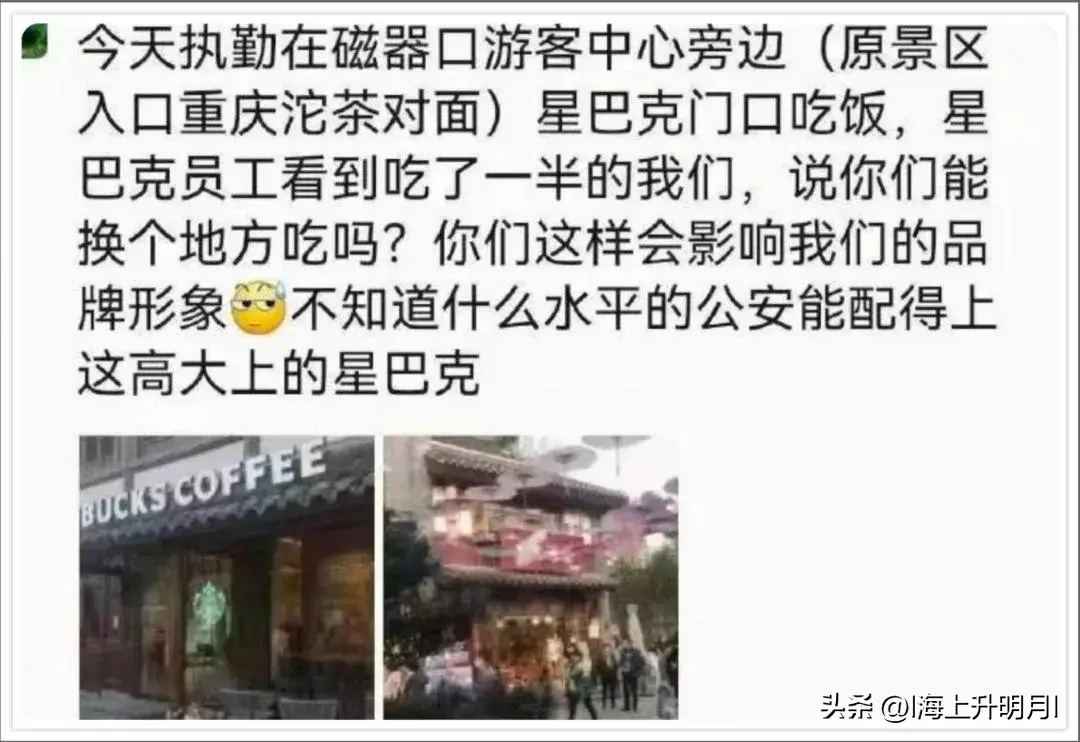 2022年2月13号,有民警执勤在磁器口游客中心旁边(原景区入口重庆沱茶对面)星巴克门口吃饭,星巴克员工看到吃了一半的民警,说你们能换个地方吃吗?你们这样会影响我们品牌形象……”