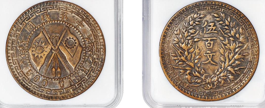 在我们民国时期的双旗币中就是铜币的价值比较高一些的就是一部分相对比较特殊一些的双旗币,比如我们市场上面的面值比较大的双旗币来说它们的市场价值就是比较高的一种钱币,双旗铜币中面值最大的就是我们市场上面的河南五百文双旗币。这种双旗币因为当时铸造出来的时候也是因为面值大的情况,这种钱币最后也是没有被发行出来。目前我们市场上面的河南五百文双旗币来说也是价值比较高的一种钱币,在我们市场上面经常可以看到这种钱币的仿品,一枚真品伍佰文双旗币来说它的价值都要过百。