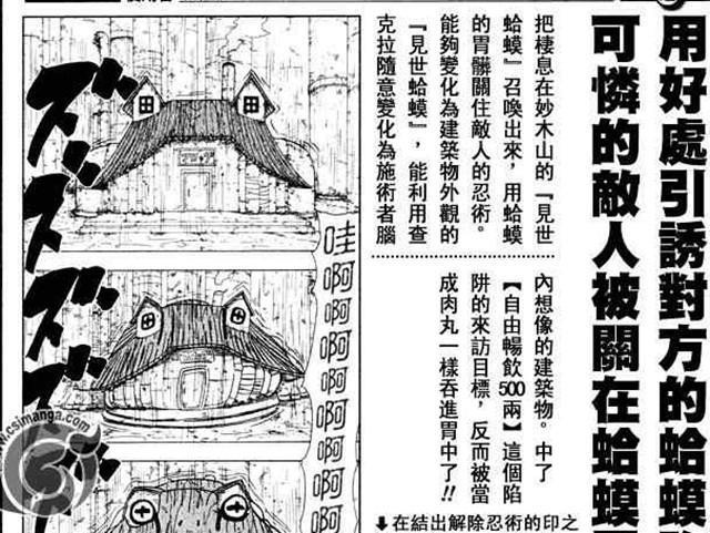 见世蛤蟆:具有神奇的变身能力,这种能力控制敌人思想。在整个妙木山中,见世蛤蟆是唯一一位具备的变身能力的。见世蛤蟆的超能力可以控制对手的思想,让自己的身形在敌人的思想里变化成房子。敌人进入了房子就会进入见世蛤蟆的肚子里,永远困在这个结界中。