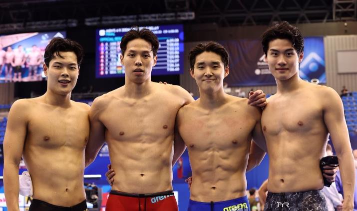 以黄宣优(20岁,江原道厅)为最后一棒的男子4乘100米混合泳接力代表队创下了韩国新纪录。30日,由蛙泳李柱浩(28岁•西归浦市厅)、仰泳崔东烈(24岁•江原道厅)、蝶泳金永范(17岁•江原体高)、自由泳黄宣优组成的韩国男子代表队在日本福冈举行的2023世界游泳锦标赛男子4乘100米混合泳接力预赛中,以3分34秒25结束了比赛。这比今年4月在汉拿杯上金宇民、崔东烈、梁在勋、黄宣优合作的男子4乘100米混合泳接力用时3分34秒96提前了0.71秒,创下了韩国新纪录。