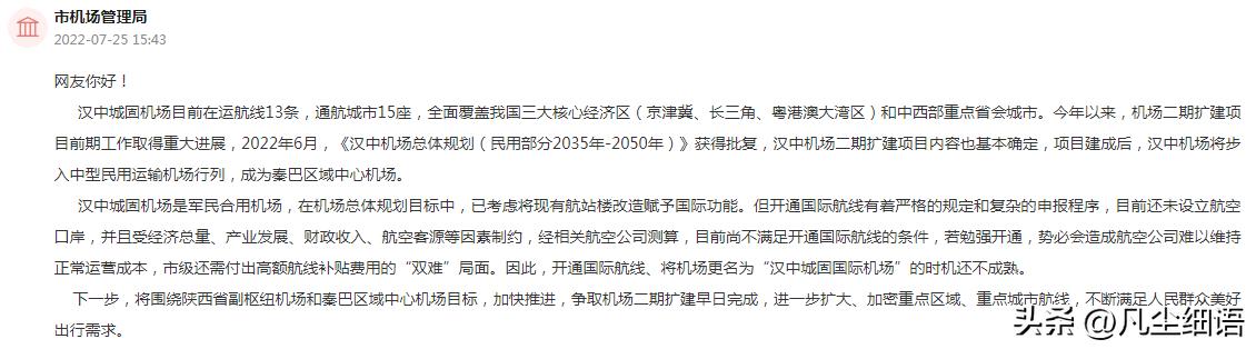 据当地一位网友介绍,2022年6月,民航西北地区管理局审查批复了汉中机场总体规划(民用部分),按照汉中机场⼆期扩建项⽬规划,汉中机场新建3万平⽅⽶航站楼,跑道延长⾄3200⽶,远近机位21个,飞行区等级4E,新修一条18米X3200米跑道,2017年5⽉10⽇,西部机场集团与汉中市委、市政府就汉中机场发展和⼆期扩建等进⾏会谈,明确将汉中机场建设成为秦巴地区区域中⼼机场、陕西省副枢纽机场,西南中南方向备降机场。