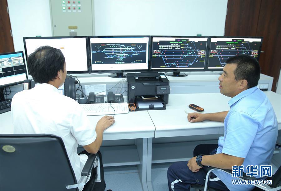 5月29日,在肯尼亚蒙内铁路蒙巴萨西站,值班站长武勇(右)和同事在行车室工作。 新华社记者 潘思危 摄