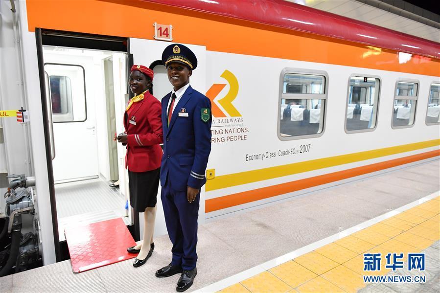 5月29日,在肯尼亚蒙内铁路蒙巴萨西站,两名列车员站在车厢门口指引试乘旅客下车。 新华社记者 潘思危 摄