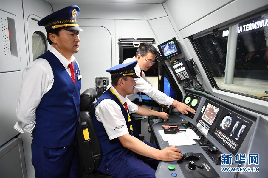 5月29日,在肯尼亚蒙内铁路蒙巴萨西站,旅客列车指导司机涂主新(右)和司机衡磊(中)、汪群在驾驶室内工作。 新华社记者 孙瑞博 摄