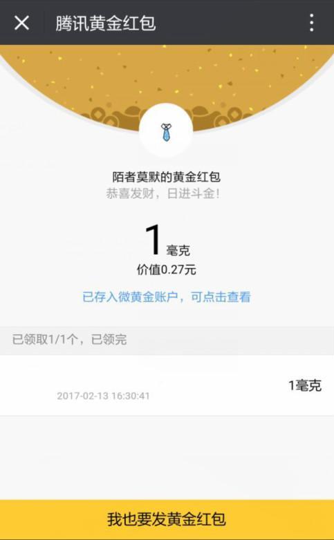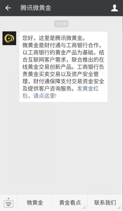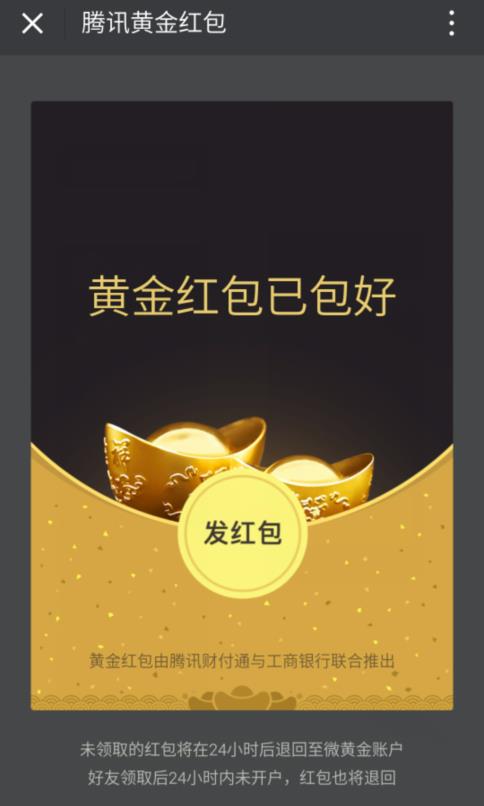 据腾讯官方的介绍,黄金红包是财付通与工商银行联合推出的“腾讯微黄金”平台上提供的服务。“腾讯微黄金”以工行的黄金产品为基础,由其提供在线黄金交易服务。