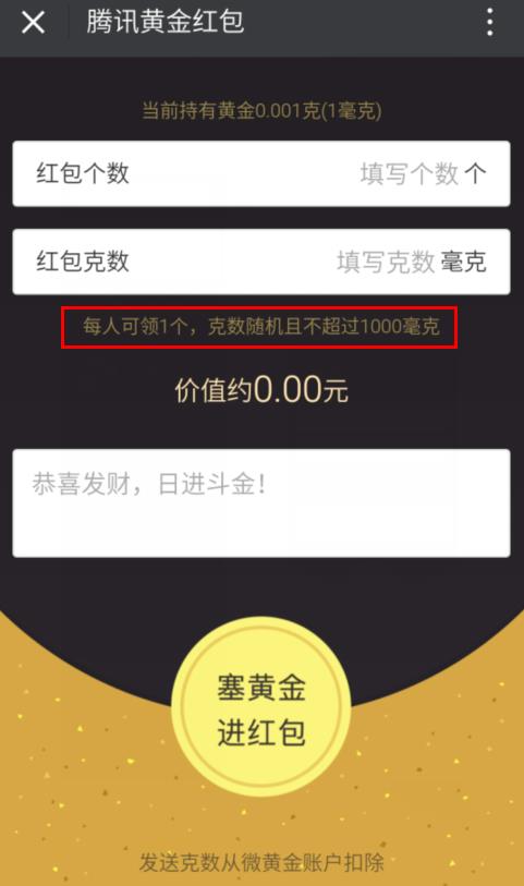 单个红包不可小于1毫克,克数随机不会超过1000毫克