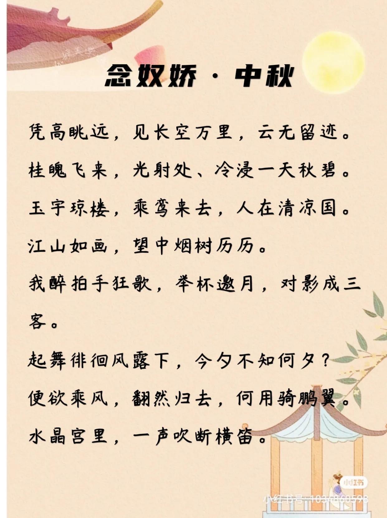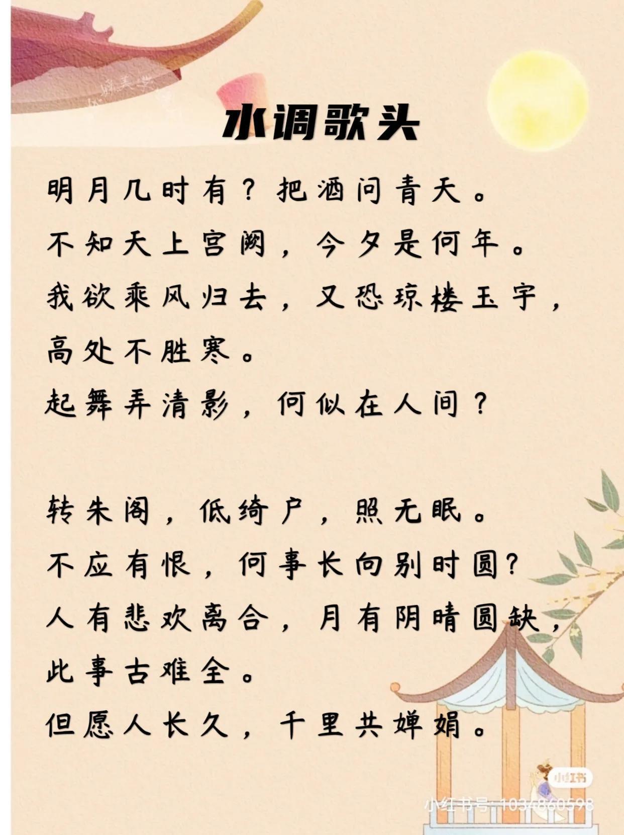 这首词是公认的中秋词中的绝唱,全篇皆是佳句,自从它的横空出世,很多写中秋的诗词都纷纷失色。它表达了对胞弟苏辙的无限怀念,也体现了苏轼既想摆脱人间、超然世外,又舍不得人世间的复杂心理。