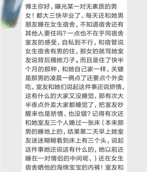 还有其他同学向记者描述,那个男生简直就是为所欲为,把这当成了自己的家,一点不拿自己当外人,两人做一些不可描述的事情,也不避讳外人,更是在凌晨两点多钟,这个男的还叫外卖,很影响大家的休息,有时候还会在女生宿舍晒自己的内裤真是不知羞耻。