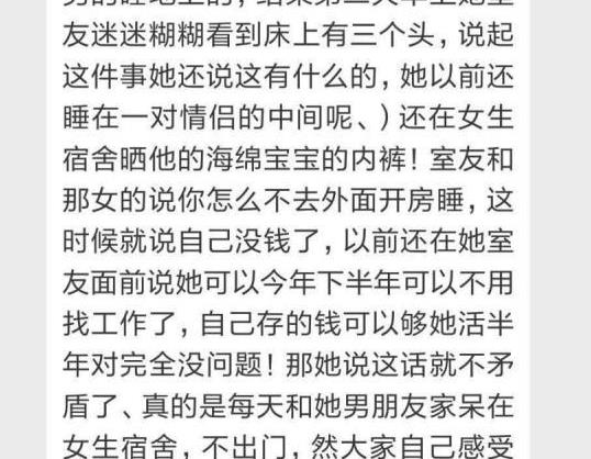 说到此处又有一名女孩向记者说道:“这还不是最过分的,有一次,他女友跟另外一个室友在一张床上睡,让这个男孩在他女友的床上独自睡觉,结果,今天早上这个男的莫名其妙的,出现在了,他女友和另一个女生的床上,面对大家的质问,那女孩却说道,这有什么的,我之前还在一对情侣之间睡过呢。”