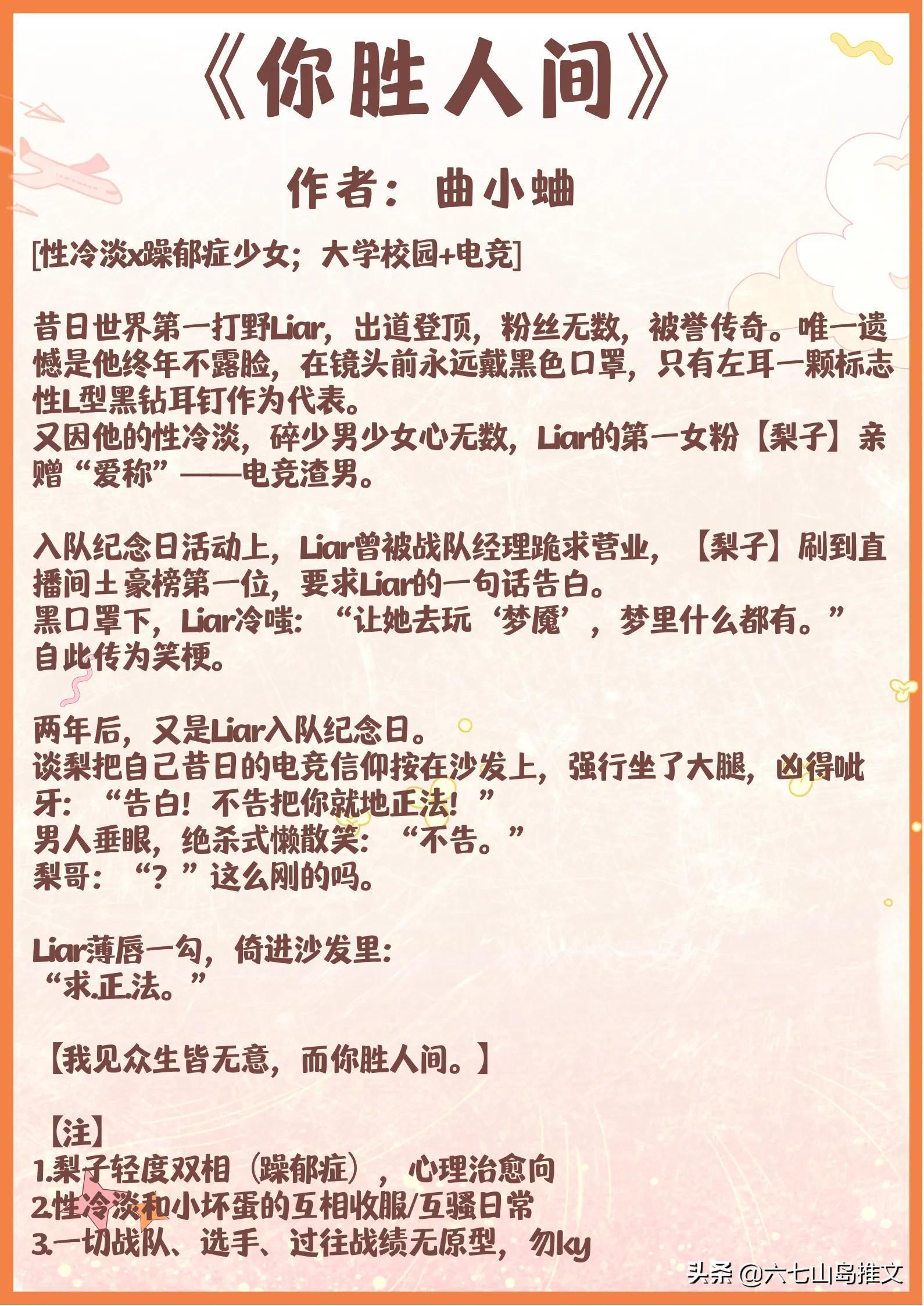 这是一篇以电竞比赛为背景的校园治愈系小甜文,女主是男主的粉丝,女主因为原生家庭影响有轻度双向情感障碍(躁郁症),奉男主为自己的电竞信仰。
