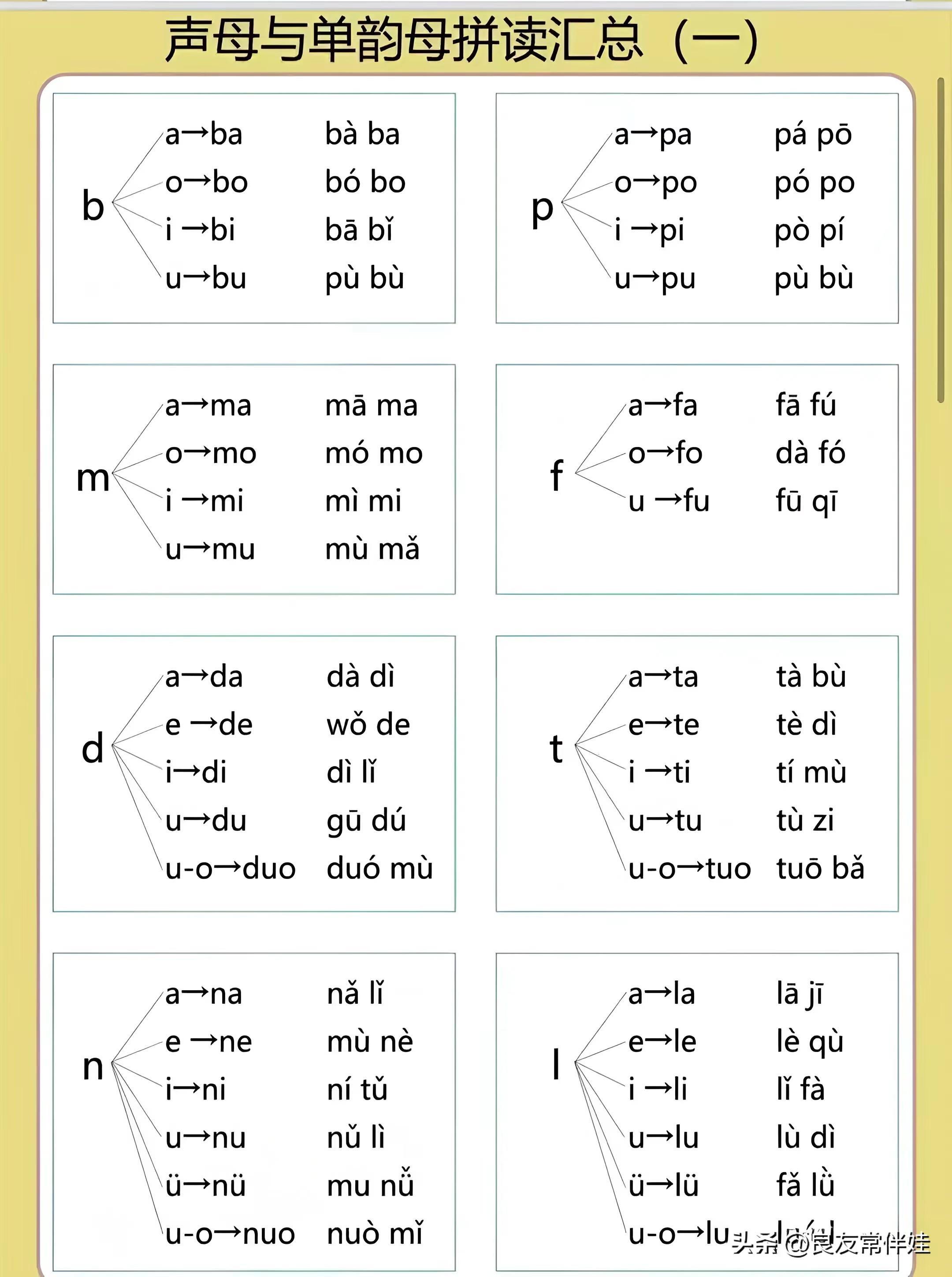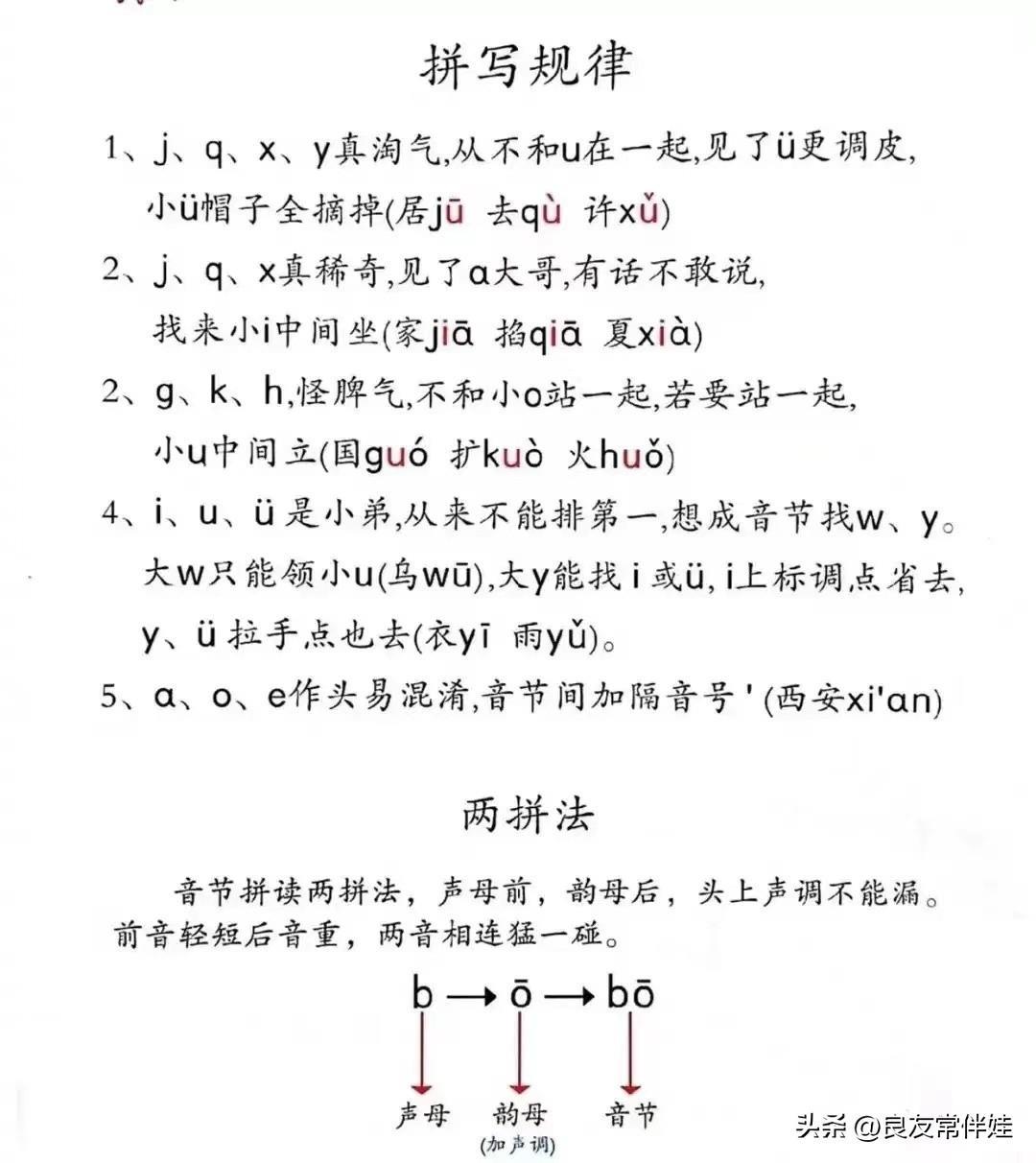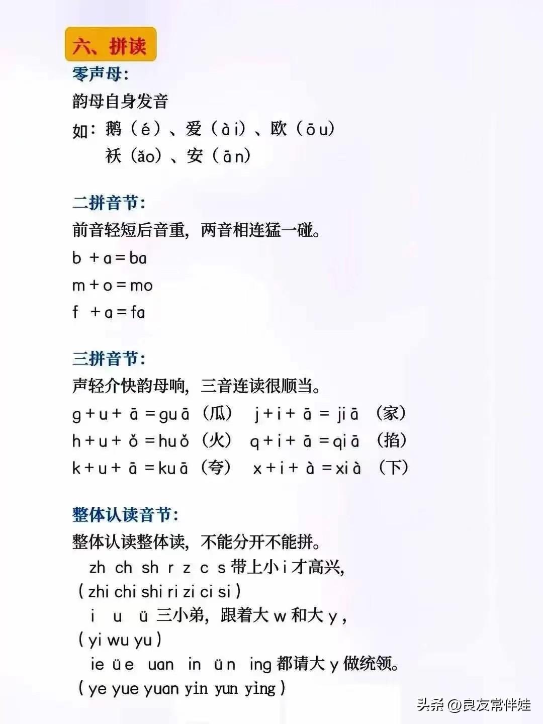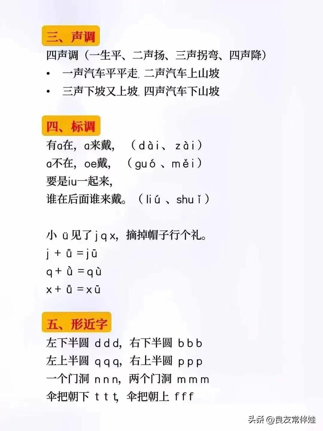 很多孩子在进入一年级后会发现单个拼音字母都会读,但是把声母和带声调的韵母组合在一起却很难拼读成一个字(音),这是为什么呢?我们都知道,要学好拼音,一些基础的知识是必须掌握的。首先,音节是拼音的基本单位,而音节是由声母、韵母、声调组成。接着,要知道拼读(二拼三拼音节)的规则,标调(相应字母位置)规则及特殊音节(整体音节)。然后,要清楚知道拼写规则(变声、轻声)与规范。最后,一定要区分清楚相似声母韵母(b\d\p\q\ui-iu\ei-ie)读音与拼写,不能混淆。只有熟练掌握这些基础,那么学拼音拼读拼写就会容易很多了。建议家长收藏好,不然想用的时候再也找不到了,实实在在的干货,快打印给孩子多练练吧!