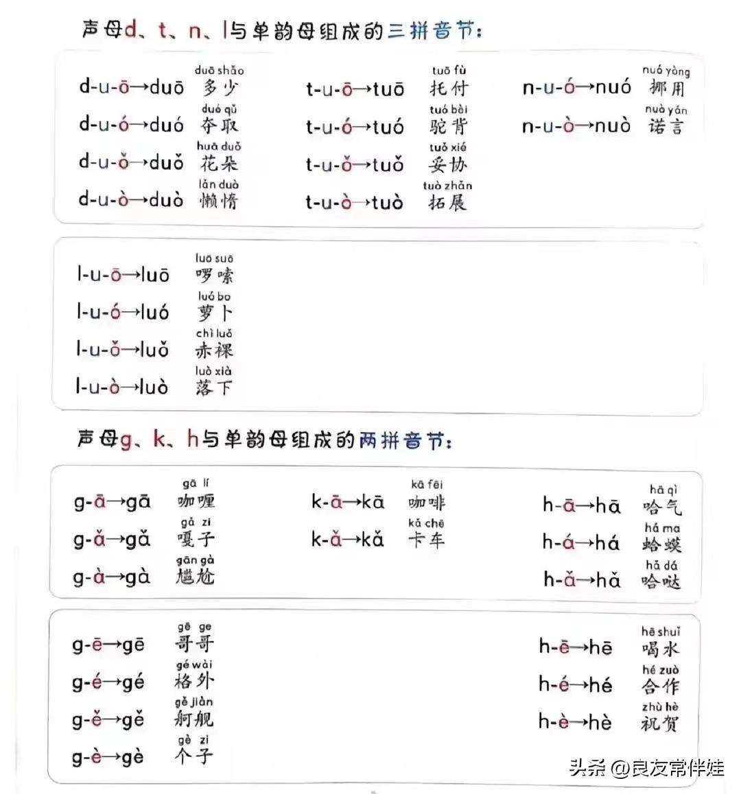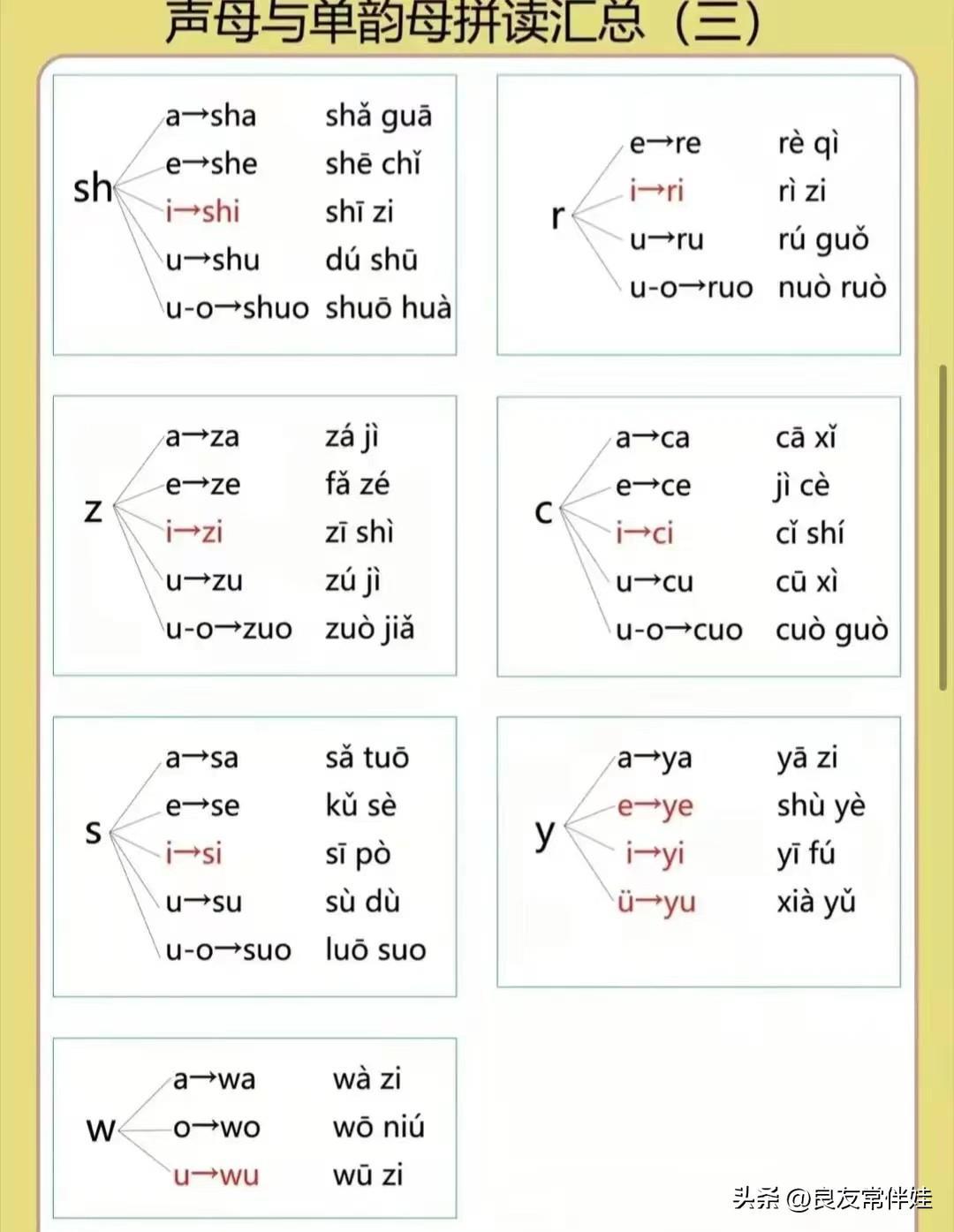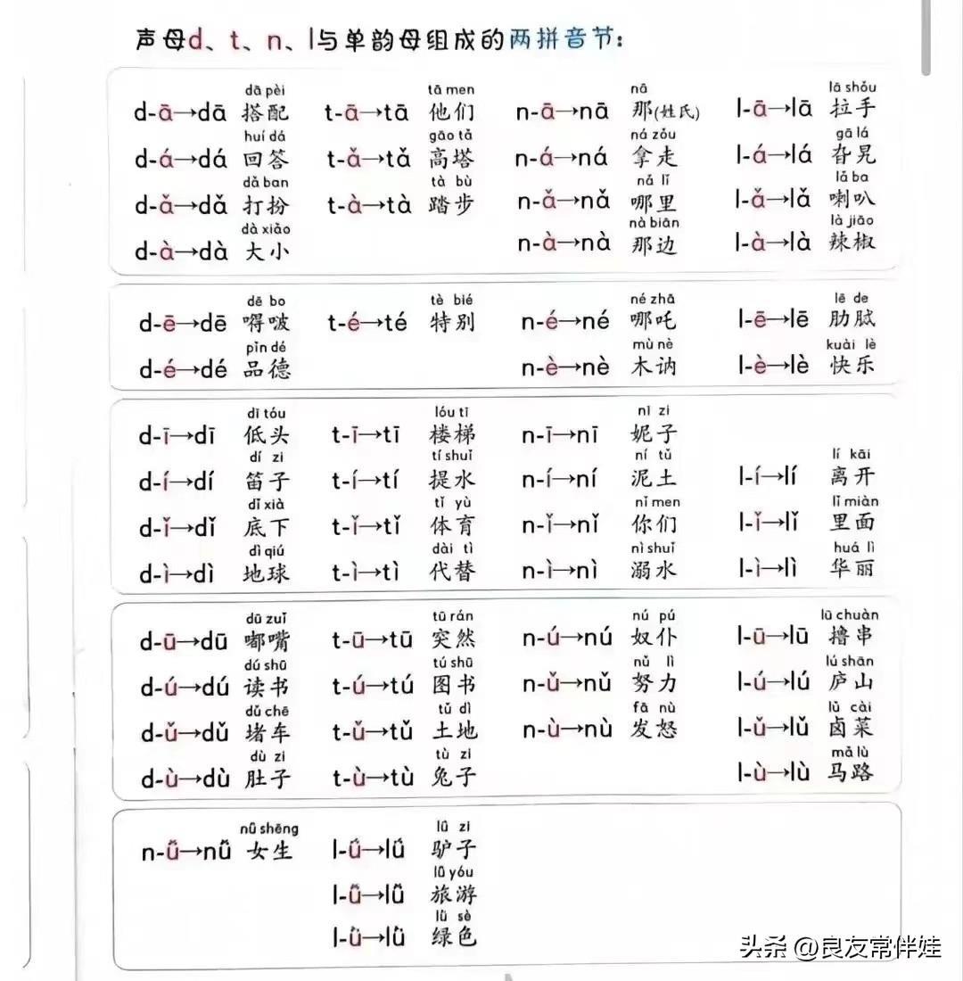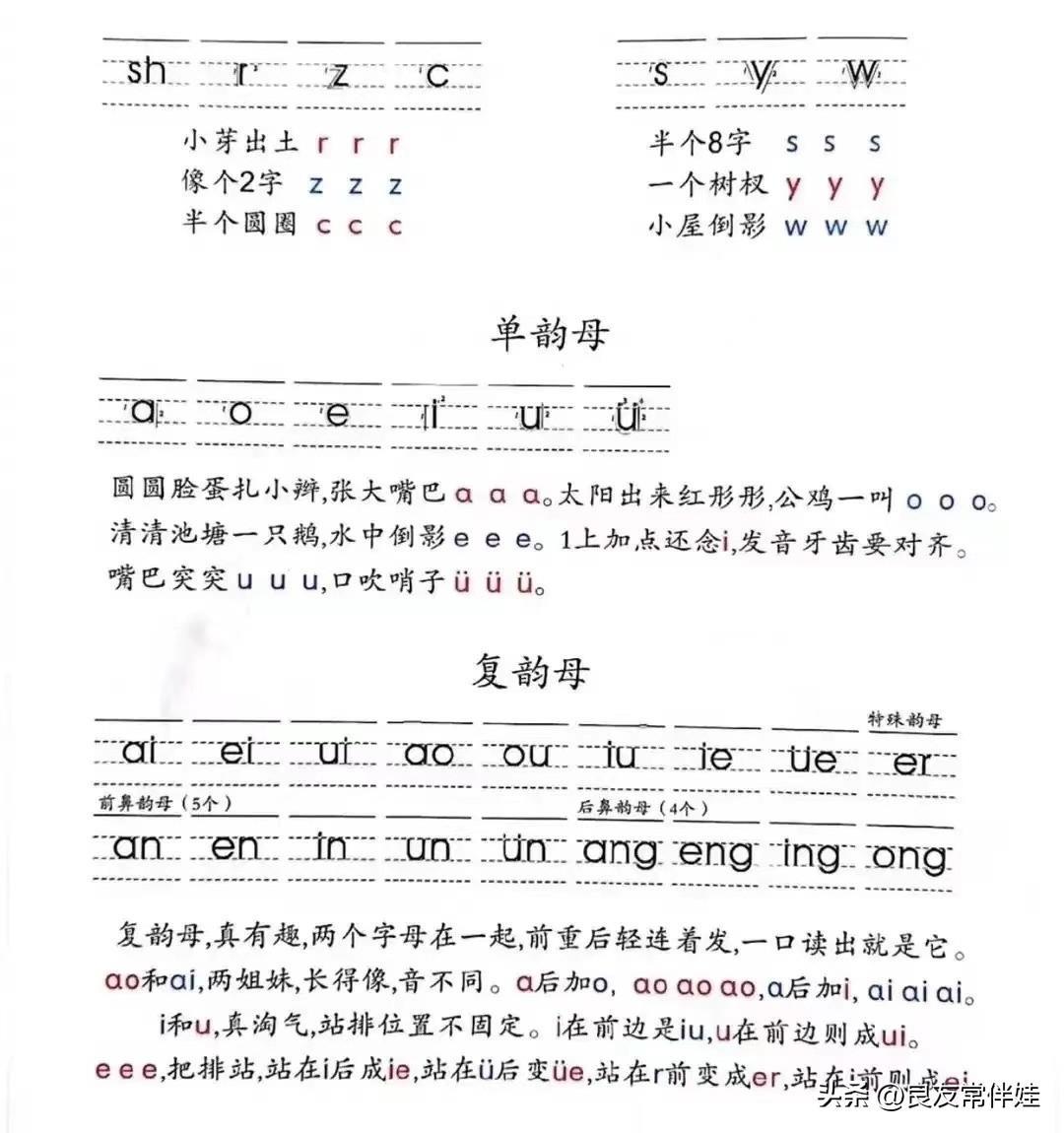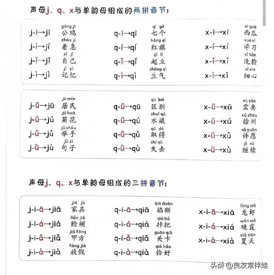 很多孩子在进入一年级后会发现单个拼音字母都会读,但是把声母和带声调的韵母组合在一起却很难拼读成一个字(音),这是为什么呢?我们都知道,要学好拼音,一些基础的知识是必须掌握的。首先,音节是拼音的基本单位,而音节是由声母、韵母、声调组成。接着,要知道拼读(二拼三拼音节)的规则,标调(相应字母位置)规则及特殊音节(整体音节)。然后,要清楚知道拼写规则(变声、轻声)与规范。最后,一定要区分清楚相似声母韵母(b\d\p\q\ui-iu\ei-ie)读音与拼写,不能混淆。只有熟练掌握这些基础,那么学拼音拼读拼写就会容易很多了。建议家长收藏好,不然想用的时候再也找不到了,实实在在的干货,快打印给孩子多练练吧!