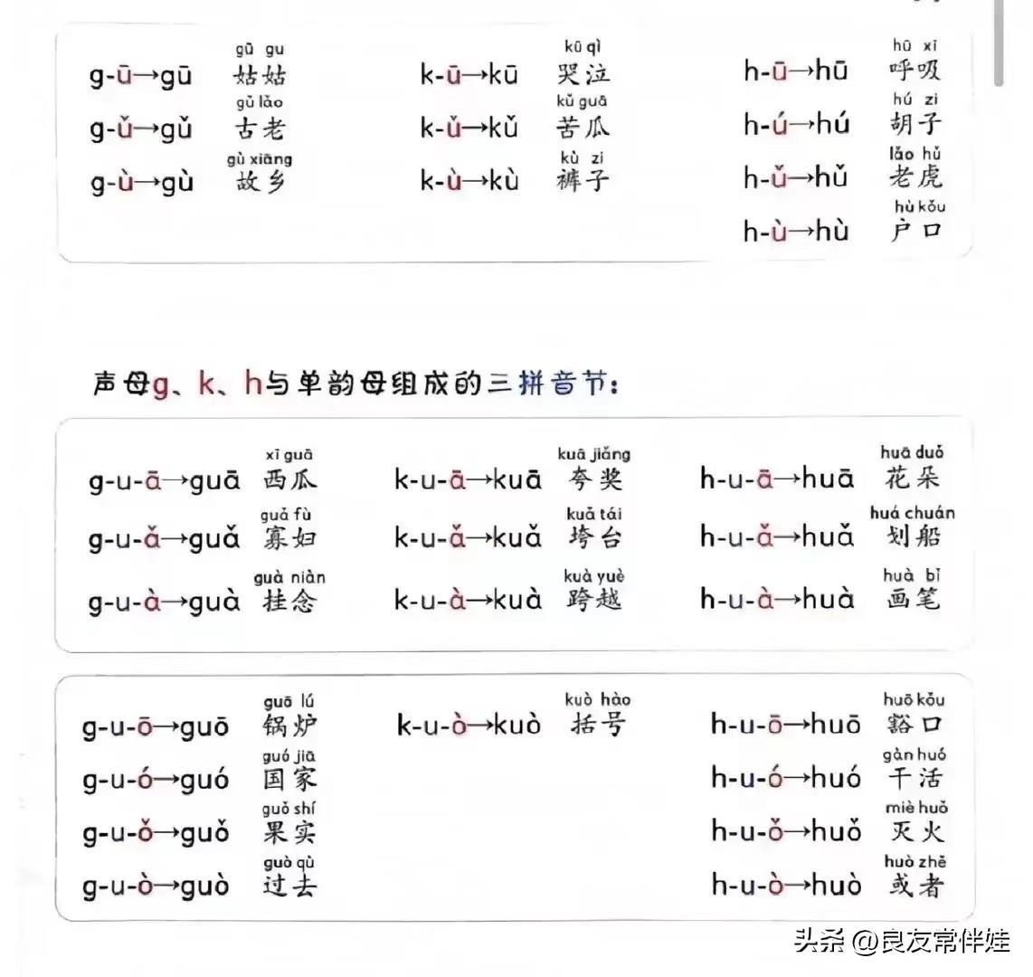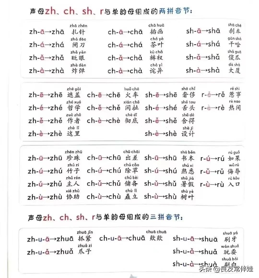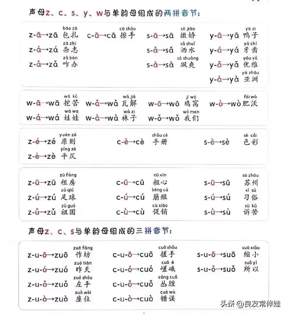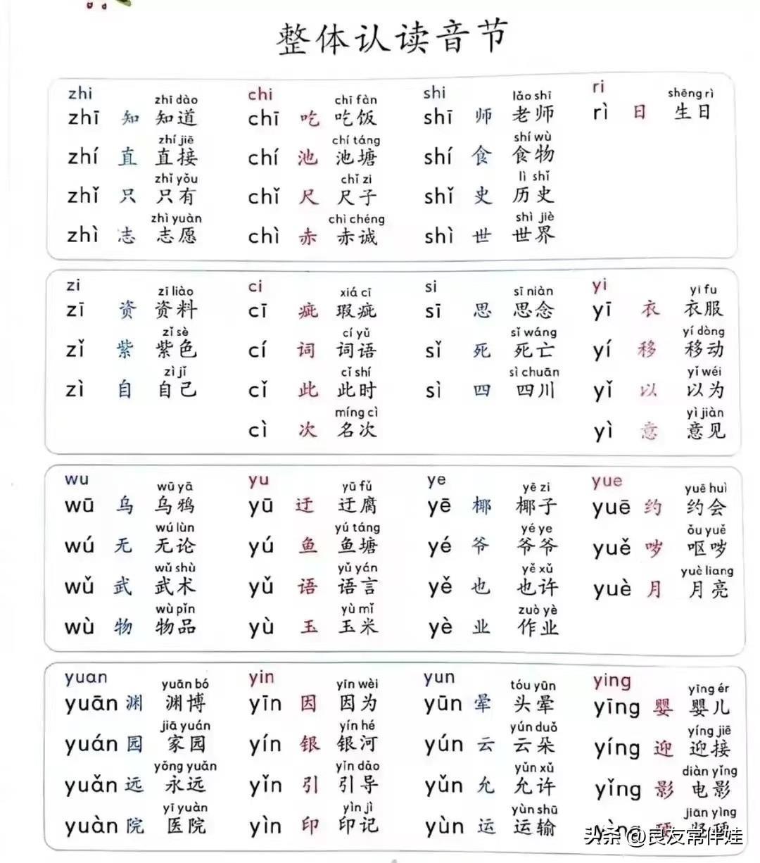很多孩子在进入一年级后会发现单个拼音字母都会读,但是把声母和带声调的韵母组合在一起却很难拼读成一个字(音),这是为什么呢?我们都知道,要学好拼音,一些基础的知识是必须掌握的。首先,音节是拼音的基本单位,而音节是由声母、韵母、声调组成。接着,要知道拼读(二拼三拼音节)的规则,标调(相应字母位置)规则及特殊音节(整体音节)。然后,要清楚知道拼写规则(变声、轻声)与规范。最后,一定要区分清楚相似声母韵母(b\d\p\q\ui-iu\ei-ie)读音与拼写,不能混淆。只有熟练掌握这些基础,那么学拼音拼读拼写就会容易很多了。建议家长收藏好,不然想用的时候再也找不到了,实实在在的干货,快打印给孩子多练练吧!