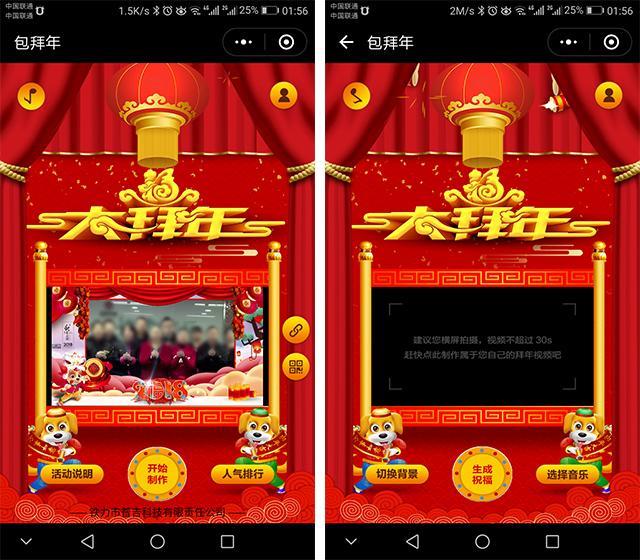我们可以通过包拜年小程序录制一个30秒的拜年视频(横屏拍摄效果极佳),并自由搭配音乐。