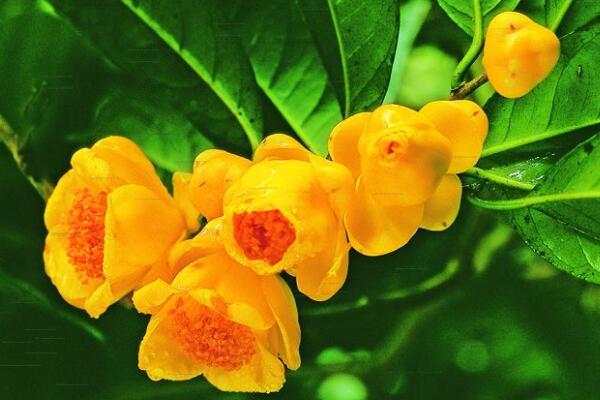 在茶花品种图片名称大全中,金花茶花金黄色,耀眼夺目,仿佛涂着一层蜡,晶莹而油润,似有半透明之感。金花茶单生于叶腋,花开时,有杯状的、壶状的或碗状的,娇艳多姿,秀丽雅致。
