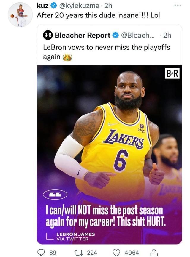 小老弟库兹马转发詹姆斯的推文后写道:“在征战20年过后,这个家伙依旧很疯狂!哈哈。”