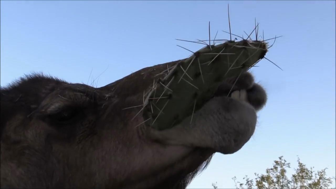 当你看到这个情形你会怎么想呢?一只骆驼正津津有味地咀嚼着布满长刺的仙人掌,看着就好疼啊。