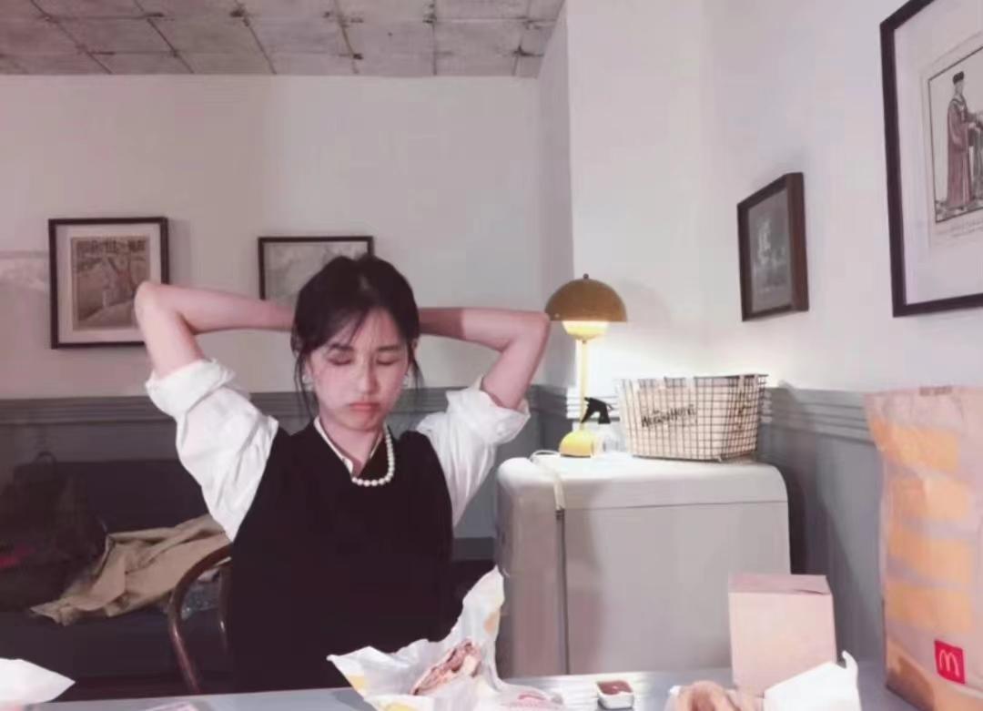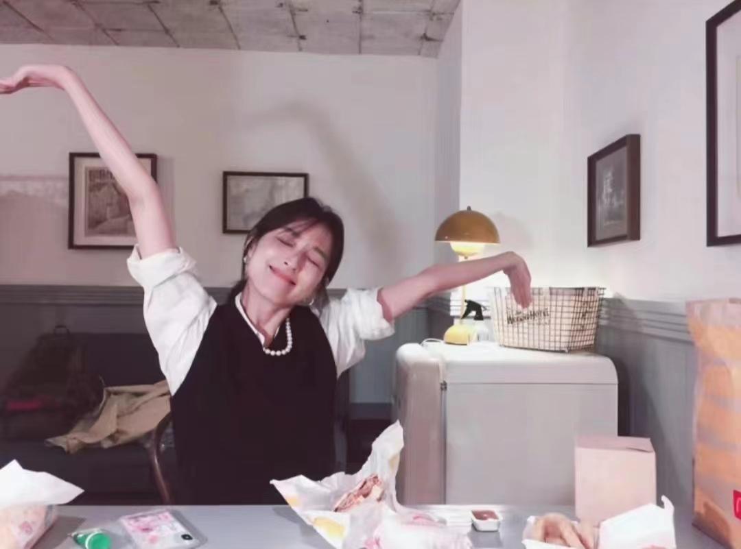 照片中的桌子上摆着还没有吃完的汉堡、薯条等快餐,大概是赵霁和好友在聚会吧。
