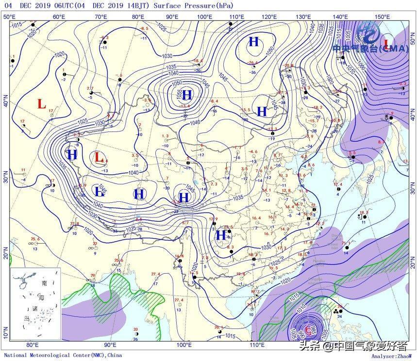 从12月4日下午的地面天气图上看,这道规则的“阴阳云”似乎和1030百帕等压线的位置一致,1030百帕和冷高压/冷空气的关系非常密切,这意味着南方的“阴阳云”可能是和冷空气的活动有关。