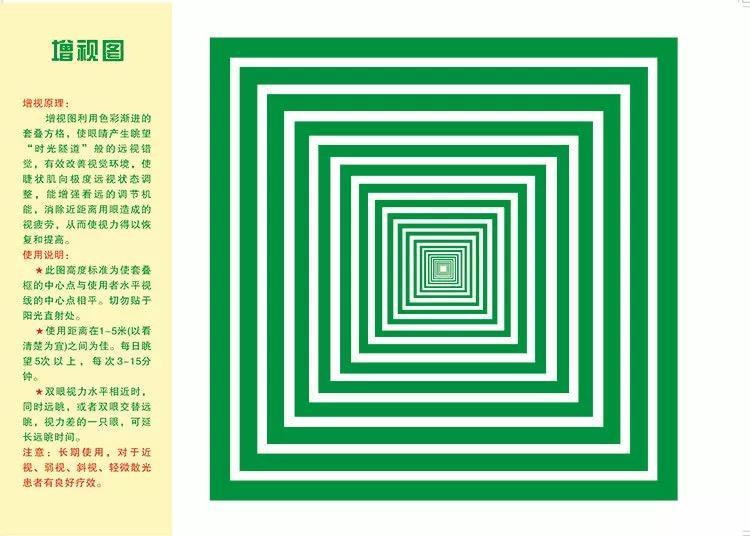 原理:增视图利用色彩渐进的套叠方格,使眼睛产生眺望“时光隧道”般的远视错觉。有效改善视觉环境,使睫状肌向极度远视状态调整。能增强看远的调节机能,消除近距离用眼造成的视疲劳,从而使视力得以恢复和提高。