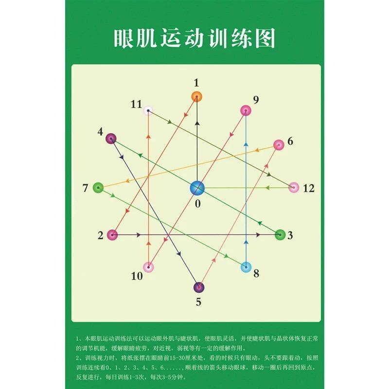 使用说明:训练视力时,将纸张摆在眼前15-30厘米处。看的时候只有眼动,头不要跟着动。按照训练连续从1看到12,顺着线的箭头移动眼球,移动一圈后再回到原点,反复进行,每日训练1-3次,每次3-5分钟。