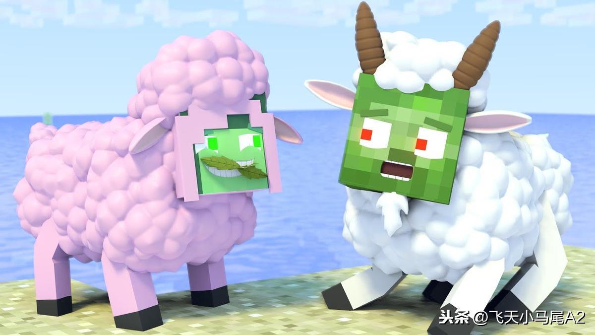 第一张是披着羊皮的狼,不对,是披着羊皮的僵尸,僵尸在我们印象中都是很可怕又很呆萌的生物,他只会在天黑的时候出现,偷偷跑进村庄感染村民,被感染的村民也会随即变成僵尸村民,好像药水可以恢复是吧!图片中这只僵尸看起来是老年羊了,还有白胡子了,他正一脸震惊的看着旁边的粉红色史莱姆羊,他很震惊为什么史莱姆披着羊皮,可他不知道的是,自己也是披着羊皮!