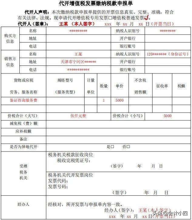 2 到了大厅之后,叫个代开发票的号,然后和工作人员要一份《代开增值税发票缴纳税款申报单》自己把这个表填写好。这个表的样子下图可见。