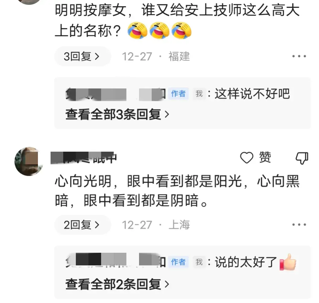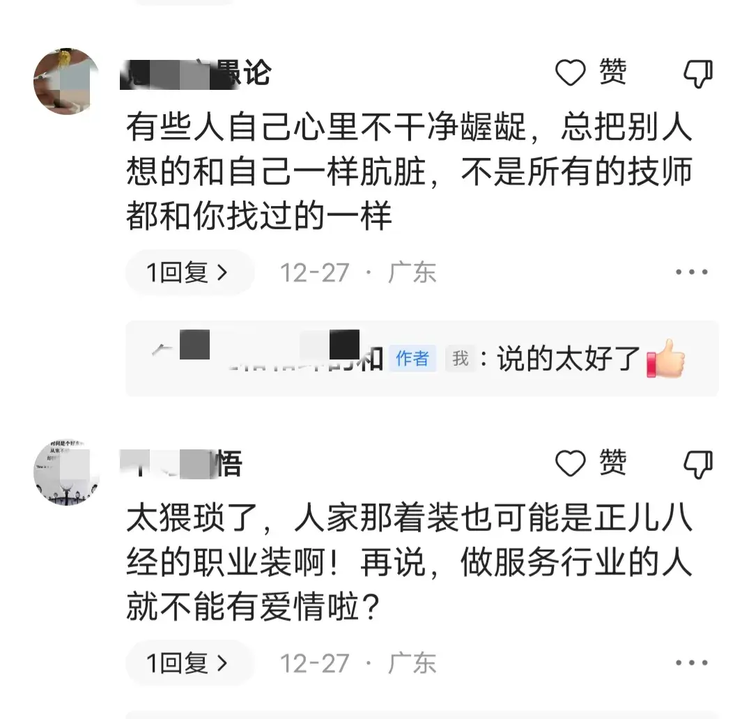 无独有偶,前两天刷到了一组也是跟女技师有关的照片,照片中看到,在一家洗浴中心内,一位年轻有为身材高大的男子单膝跪地表白一名女技师,最后表白成功,两人相拥在一块。男子发布到网上本想得到大家的祝福,可是评论区的一句过分解读:“我最讨厌给共享单车上锁的人”引来众多网友的跟帖,内容更是乌七八糟。对此,有网友说“有些人自己心里不干净龌龊,总把别人想的和自己一样肮脏,不是所有的技师都和你找过的一样”