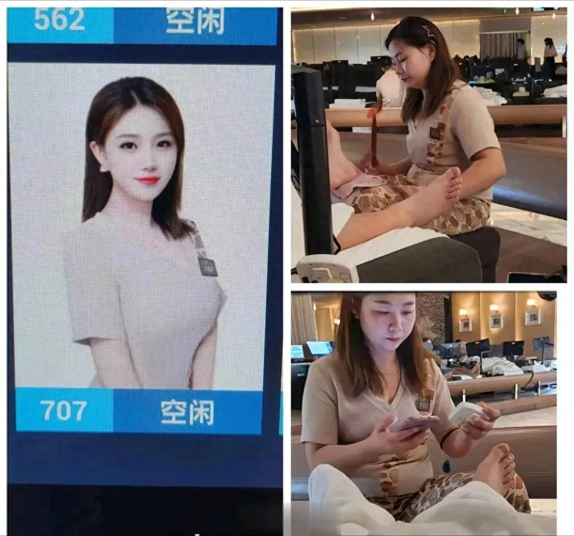 从这位男子拍摄合成的照片可以看到,707号女技师当时处于空闲状态,对外宣传的照片给人的感觉是一位亭亭玉立、温文尔雅的美女,于是这个男子毫不犹豫的选择了她。正当男子为自己的小幸运沾沾自喜的时候,过了一会儿,一位大姐出现在他的面前,对他说:“你好,先生,我是707号女技师,很高兴为您服务,我们的店非常正规,这是我的技师证,如果有什么不满意的地方,欢迎提出宝贵意见”。看到跟自己想的不一样的女技师,男子有点懵,重复了一句:“不好意思,我选的是707号技师”。女子指着自己的胸牌说:“对啊,没错,我就是707号”。男子无奈只能伸出了脚,心想,这也太离谱了吧!本人跟照片竟然差距那么大!
