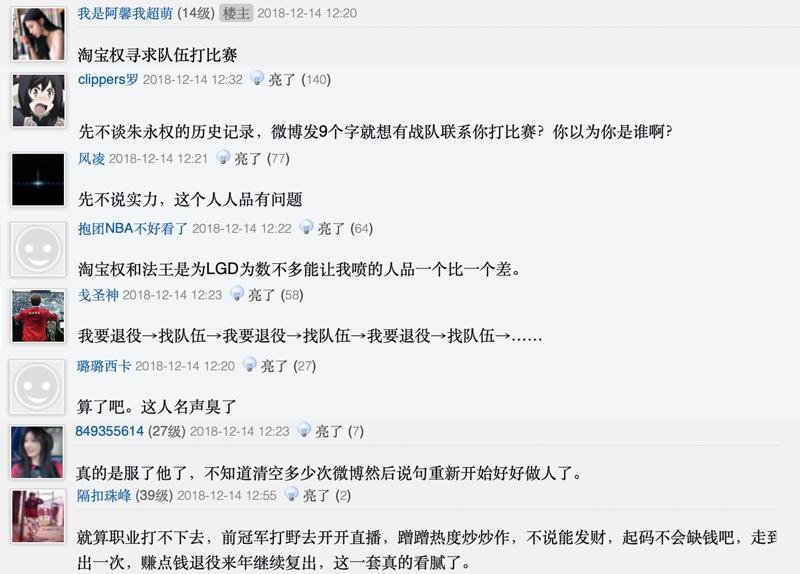 还有网友表示“淘宝权和法王是为LGD为数不多能让我喷的人品一个比一个差,真的是服了他了,不知道清空多少次微博然后说句重新开始好好做人了,淘宝权的套路我已经摸清楚了,我要退役→找队伍→我要退役→找队伍→我要退役→找队伍→……”