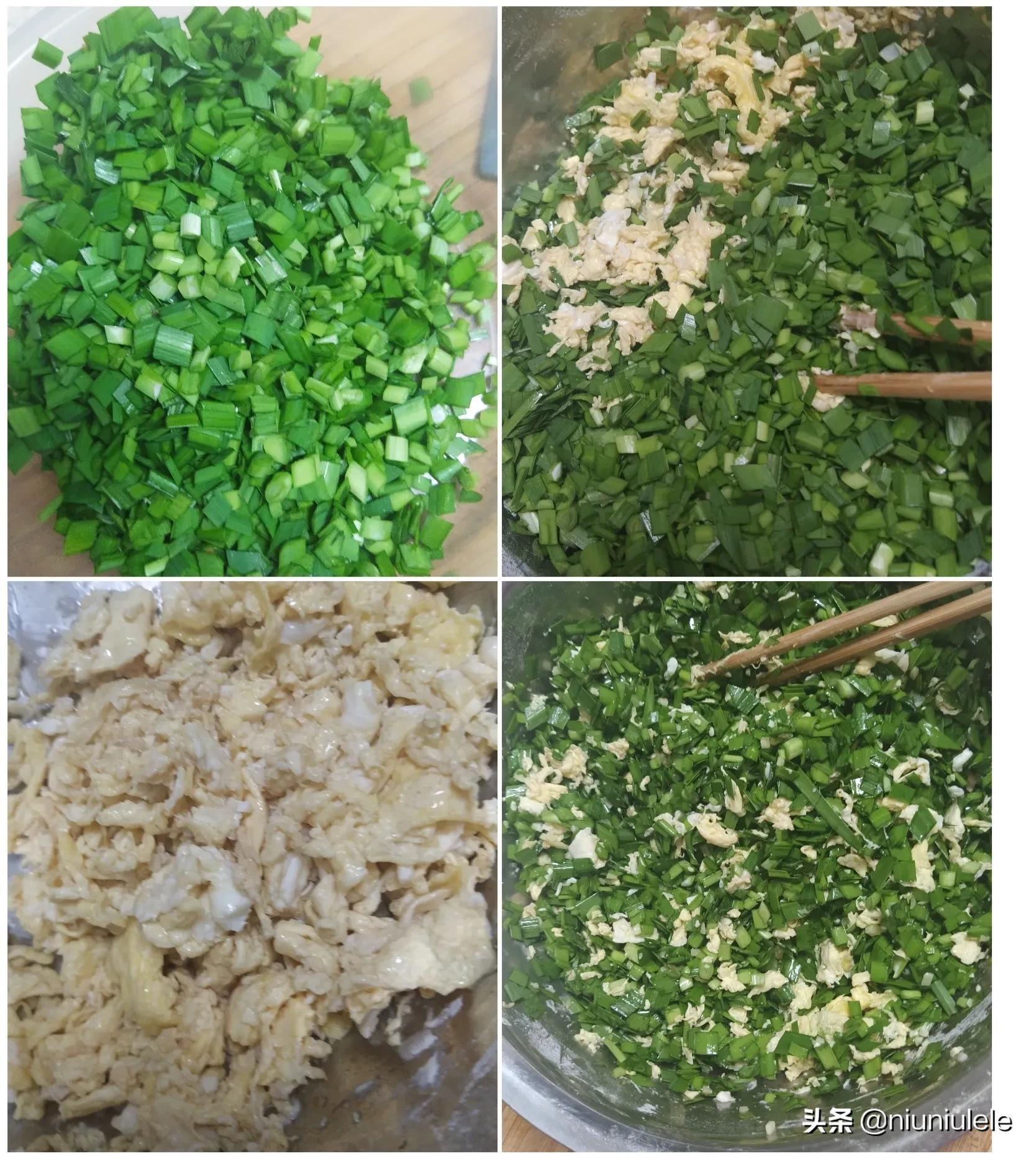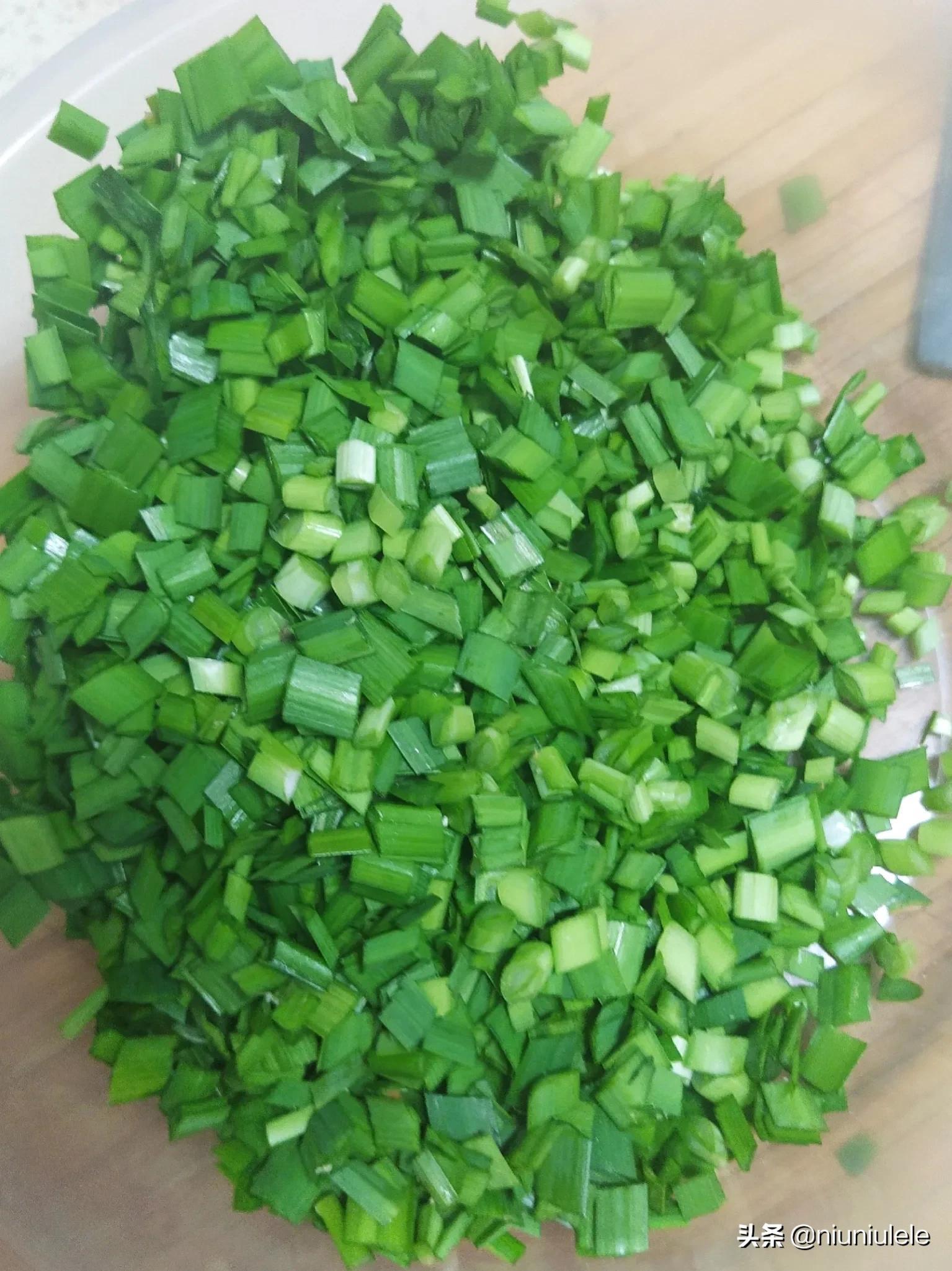 第二步:调馅。炒3个鸡蛋放凉,韭菜洗净切丁,加少许些盐,花椒面,少许油,调在一起。