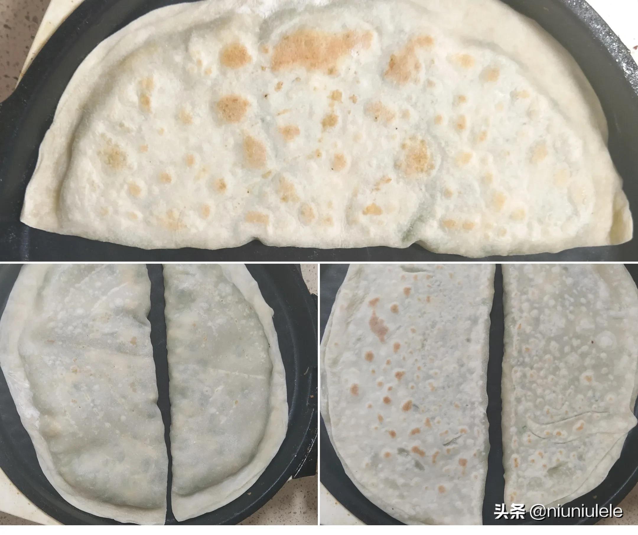 第三步:擀面皮摊菜饼。这一步很考验技术,但我介绍这种方法只要擀成一个薄面片,一边摊上调好的馅,另一边没馅的折到有馅的一边,边缘按好不露馅,就成功了。这种半圆菜饼简单易做,做的还比较快,是不错的选择。