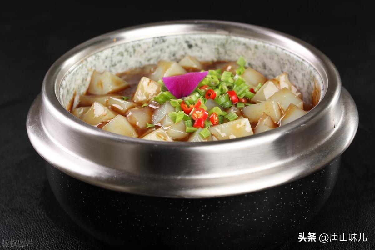 3.冷皮凉粉:将凉粉切成碎块,加入大葱花、胡萝卜丝、黄瓜丝、豆芽、辣椒油、醋、酱油等调料搅拌均匀,就能做出一份清爽可口的凉皮凉粉。该菜口感鲜爽、多变,是个人喜好的选择口味,同时也是牛肉面的配菜之一。