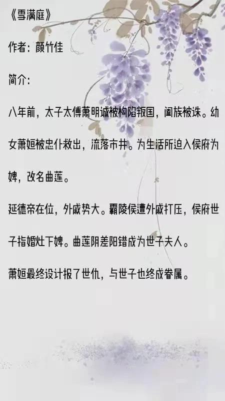 《雪满庭》非常耐看的一篇文,不雷不白不苏,文笔超级好!架构很庞大完整,情节部分虽说有些生硬,但是瑕不掩瑜,人物形象生动饱满,整体阅读感棒棒哒!