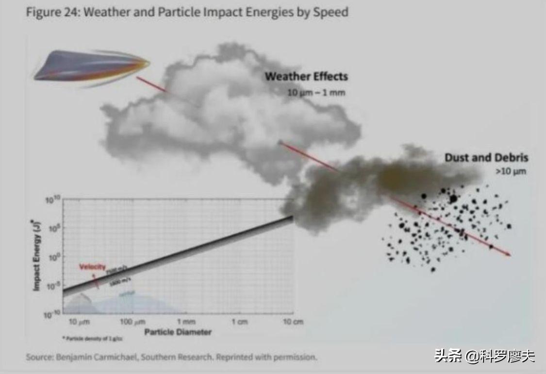由于在高超声速飞行器大多数是在数万米的大气层边缘飞行,极端速度可以达到10马赫左右,因此即使是大气层中的微小粒子,极轻微的粒子撞击也会产生“子弹一样的动能”,并造成高超武器“结构破坏或不可预测的空气动力或热效应改变”。