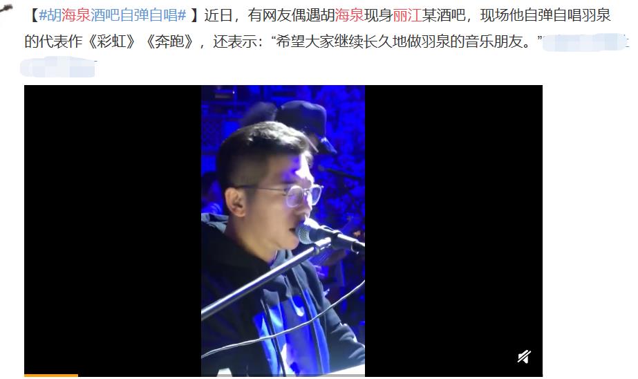 1月29日,有网友在网上曝光自己在丽江酒吧内偶遇到海泉的视频,近日在丽江旅游的海泉在酒吧里一展歌喉,现场自弹自唱羽泉的代表作《彩虹》和《奔跑》,引起路人纷纷围观。
