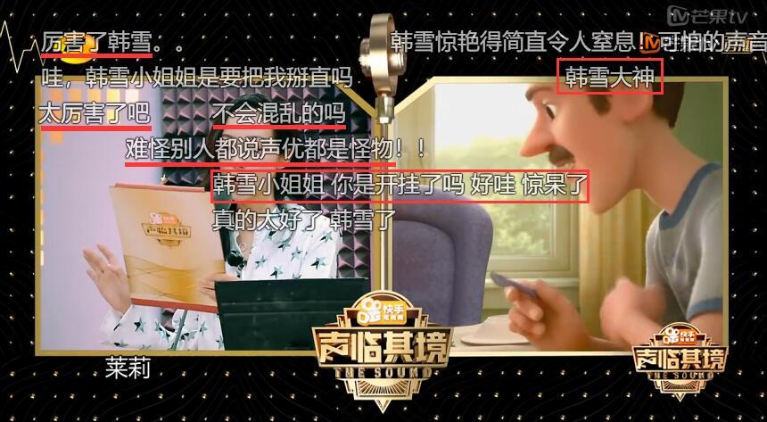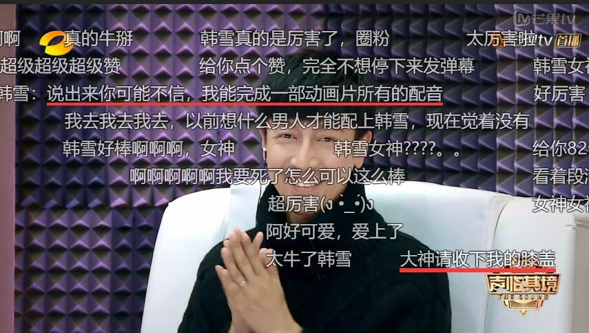 再来看看弹幕大军,网友都表示韩雪女神真的是太厉害了,八个声音都不会混乱,简直就是大神;也有网友说韩雪简直就是开挂了!还有网友用韩雪的身份调侃说:说出来你可能不信,我能完成一部动画的所有配音。虽然有点夸张,但是韩雪确实是很厉害。