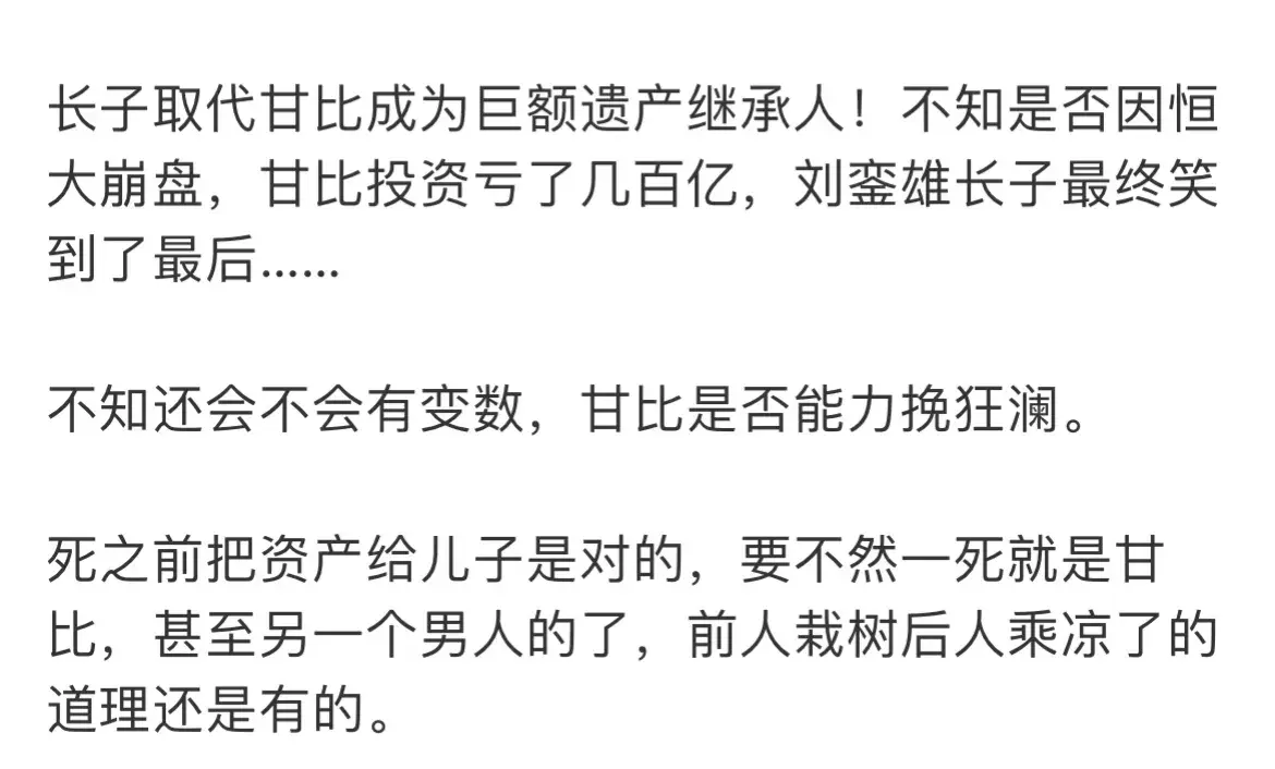 对于刘銮雄突然变更遗嘱,外界猜测跟恒大崩盘,甘比投资亏损了几百亿有关系。