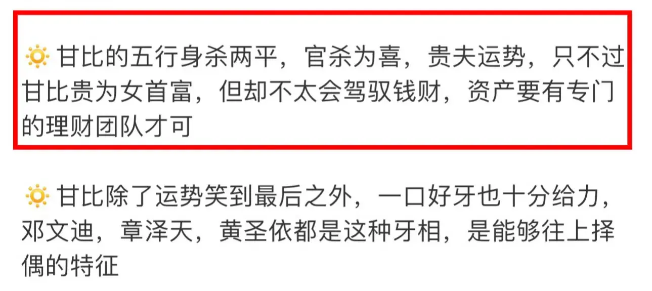 早些年,有人说甘比的面相就是大富大贵之相,跟郭晶晶、章泽天等人属于同一种牙相,是属于可以向上找夫君的面相。