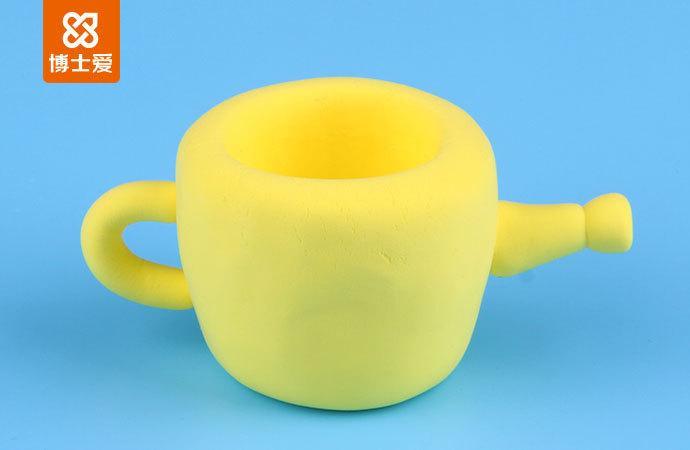 然后用黑色粘土做一个杯垫放在下面,杯子顶部用黄色粘土搓一根细条然后环绕在上面。