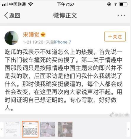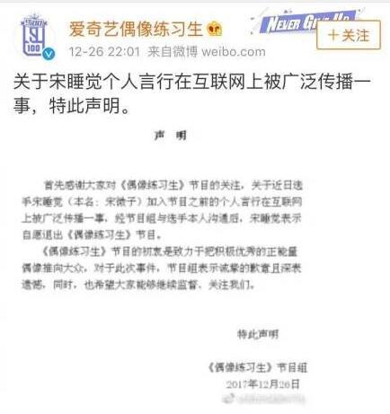 这个人睡眼惺忪,张不开眼的样子,估计名字就是这么来的吧。宋睡觉悄然进入大众视野,不过这种方式并不光彩,因为参加《偶像练习生》,宋睡觉以前的不良言论被网友翻出,大骂TF boys和SNH48,被爱奇艺退赛也是应该的。