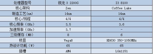 i3-8100采用的也是14nm工艺,拥有4核4线程,主频3.6GHz,同样TDP 为65W。核显核心为Intel HD Graphics 630 核显拥有24GEU单元,核心方面是GT2级别。i3-8100的主频和比Ryzen 3 2200G差不多, i3-8100的单核性能要强,Ryzen 3 2200G整体性能相对高一些。但是Ryzen 3 2200G的核显性能完全碾压i3-8100的核显。