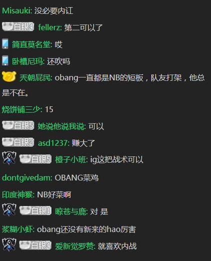 错觉发现了obang的位置后,用一把汤姆逊将他击杀,IG用一波一换四带走NB,NB被IG灭队,弹幕里的观众纷纷不满obang的行为,他们觉得obang这几场下来一直没有融入战队,是战队的短板。