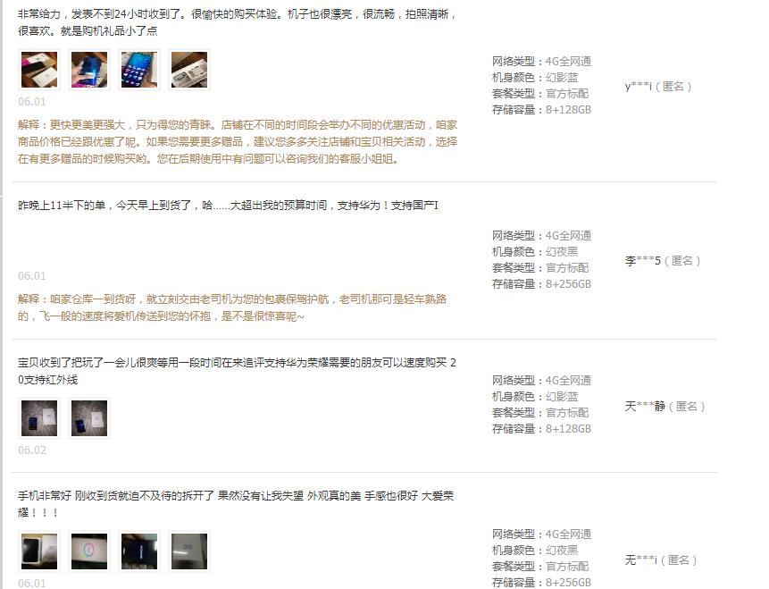 第一站我们来到了荣耀的大本营华为官网,目前在华为官网荣耀20收到了11304条评论,好评率为99%。得到的基本都是好评,说实话很难在茫茫上万条的评论中去寻找一条差评。我翻了半天也没有翻到一条略尴尬。