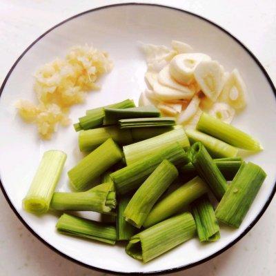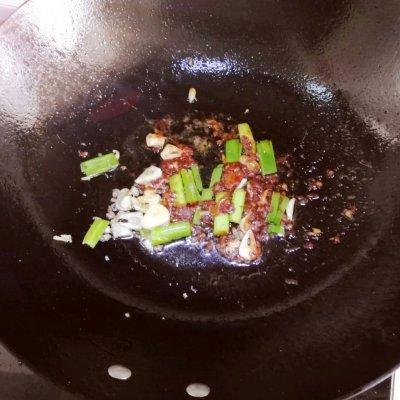 12、热锅凉油,下入蒜苗,姜末,蒜片,然后放一勺豆瓣酱,炒出红油。