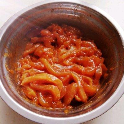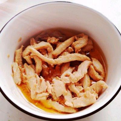 9、鸡胸肉切丝,加少许盐,料酒,胡椒粉,生抽,淀粉腌制20分钟。