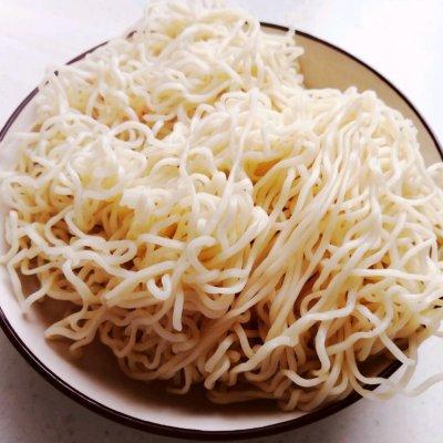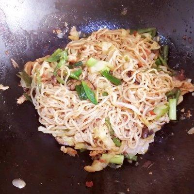 14、再下入细面条,搅散,放少许盐,生抽,蚝油,鸡精,大火翻炒几下,关火盛盘。