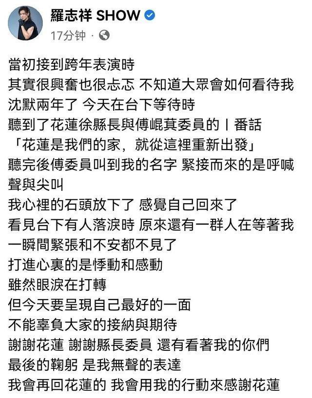 正式登台之前,罗志祥的经纪人表示,罗志祥心情非常激动,已经两年没有登台了,所以很兴奋,在表演结束后罗志祥还发文表示,非常感谢花莲县县长,当他听到“花莲是我们的家,就从这里重新出发”这句话时内心非常感动。